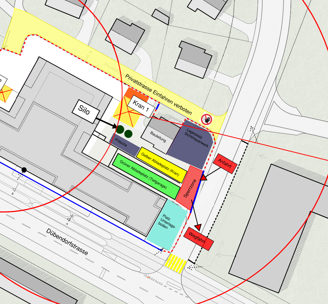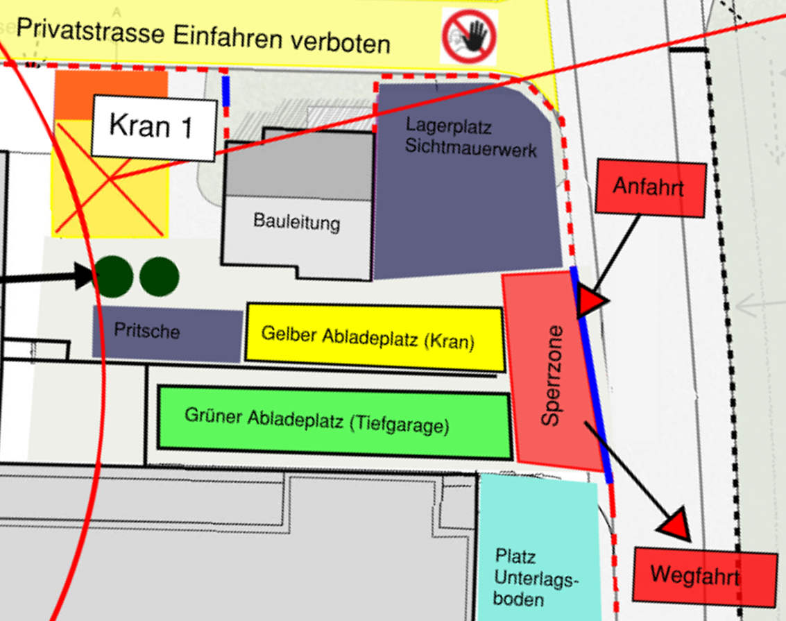 15/21 Mattenhof 3, Dübendorfstrasse 333, Zürich AnlieferungZufahrt:Nur über Altwiesenstrasse.Anweisungen des Baustellenpersonals sind zu befolgen.Baukran: - Nutzung nach Anmeldung bei der Bauleitung.Allgemeine RegelnDie Kranbenützung muss dem Polier 5 Tage im Voraus per Telefon/Logistikportal mit genauer Uhrzeit und Benutzungsdauer bekannt gegeben werden.Ein genereller Anspruch auf den Baukran besteht nicht. Der Polier disponiert. Ohne Helm kein KranDie unterschriftsberechtigte Person hat vor der Benutzung der Baukrane, beim Polier den Kranrapport und die Wegleitung Kranbenützung zu unterzeichnen.Verrechnung: bis 1/2 Stunde: Kranzug - ab 1/2 Stunde: Kranstunden.Kranrapporte sind immer vollständig auszufüllen.Die transportierte Last ist zwingend mittels Kranhakenversicherung versichert. Deckung bei Schäden: bis 50'000 CHFRechnungsstellung monatlich. Zahlungsfrist 30 Tage rein netto. Kein Rabatt. Kein Skonto. Bei Zahlungsausständen werden die Kranzüge eingestellt.Der Baumeister stellt Ketten / Palettengabel als Anschlagemittel zur Verfügung. Alle anderen Anschlagemittel (Gurten, Netze etc..) müssen die betreffenden Firmen bereitstellen. (Es dürfen nur geprüfte Anschlagemittel verwendet werden.)Jedes Anschlagemittel muss mit einer Prüfplakette versehen sein.Es gilt die SUVA Verordnung Anschlagen von Lasten zu befolgen. (www.SUVApro.ch) nach Art. 6 der Kranverordnung. Zuwiderhandlung führt zur umgehenden Wegweisung von der Baustelle.Kosten: 150 CHF/Std., 80 CHF/ZugKranraport DownloadxxxxxxxxxxxxxxxxxxxxxxxxxxxxxxxxxxxxxxxxxxxxxxxxxxxxxxxxxxxxxxxxxDer Grüne Abladeplatz ist nur vom 11.11.24 bis 25.11.24 buchbar.xxxxxxxxxxxxxxxxxxxxxxxBei Anlieferungen muss ein Einweiser die Fahrzeuge einweisenHelmtragepflicht auch für LieferantenParken:Keine Handwerkerplätze vorhanden.Bei Missachtung fallen Strafen an.Logistikkalender 15/21 Mattenhof 3, Dübendorfstrasse 333, ZürichAnlieferungen gelten erst als bestätigt nach einer Rückmeldung durch die Bauleitung. Überbuchungen vom Kran oder Abladeplatz gelten als Abgelehnt. Bitte prüfen Sie die Verfügbarkeit des gewünschten Abladezeitraums (Es kann nichts in den Kalender eingetragen werden)Firmendaten Die Felder Adresse, PLZ/Ort, Referenz für Rechnung, Zuständige Person und Telefon sind für Kranablad Plicht Gewünschte Abladezeit (Bitte nur Zeit eintragen, die im Kalender noch frei ist) Abladedatum / Lieferdatum*01020304050607080910111213141516171819202122232425262728293031day / JanuarFebruarMärzAprilMaiJuniJuliAugustSeptemberOktoberNovemberDezembermonth / 2027202620252024year Abladezeit von*HH : MM Abladezeit bis*HH : MM Firma (Rechnungsadresse)* Adresse (Rechnungsadresse Pflicht Kranablad) PLZ/Ort (Rechnungsadresse Pflicht Kranablad) Referenz für Rechnung Pflicht Kranablad Zuständige Person (Rechnung Pflicht Kranablad) Telefon (Rechnung Pflicht Kranablad) Zuständige Person (vor Ort)* Telefon (Person vor Ort)* E-Mail* Was wird angeliefert (Pflicht Kranablad) Material Menge (z.B. Anzahl Paletten Pflicht Kranablad)Zur Verfügung Steht: Baukran / Palettengabel für SBB Paletten / 2x Kranketten 6mm / 6ToDie Felder "Was wird angeliefert" und "Material Menge (z.B. Anzahl Paletten)" sind bei Kranablad PflichtAblade-Art Abladeart(1)Selbstablad (Grüner Abladeplatz)Selbstablad (Gelber Abladeplatz)Kranablad mit Platz (Gelber Abladeplatz)Nur Kran (ohne Abladeplatz)SendenlöschenAllgemeine InformationenBei Unklarheiten bitte rechtzeitig den Bauleiter kontaktieren.Ansprechpersonen:Bauleiter Andrin Huwiler andrin.huwiler@gross-ag.chProjektleiter Igor Pelivan igor.pelivan@gross-ag.ch Kontaktperson Baumeister Kevin Neuhaus 8042-mattenhof-bau@baltenspergerbau.ch